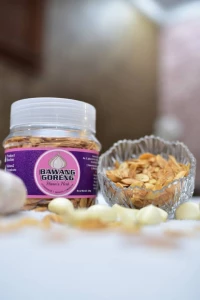 Menyajikan pilihan bawang putih gorengan yang kurang minyak, bebas MSG dan tanpa bahan tiruan yang sangat sesuai dijadikan sebagai makanan kudapan sihat untuk semua peringkat golongan umur . Bawang putih amat bagus untuk meningkatkan immune tubuh.